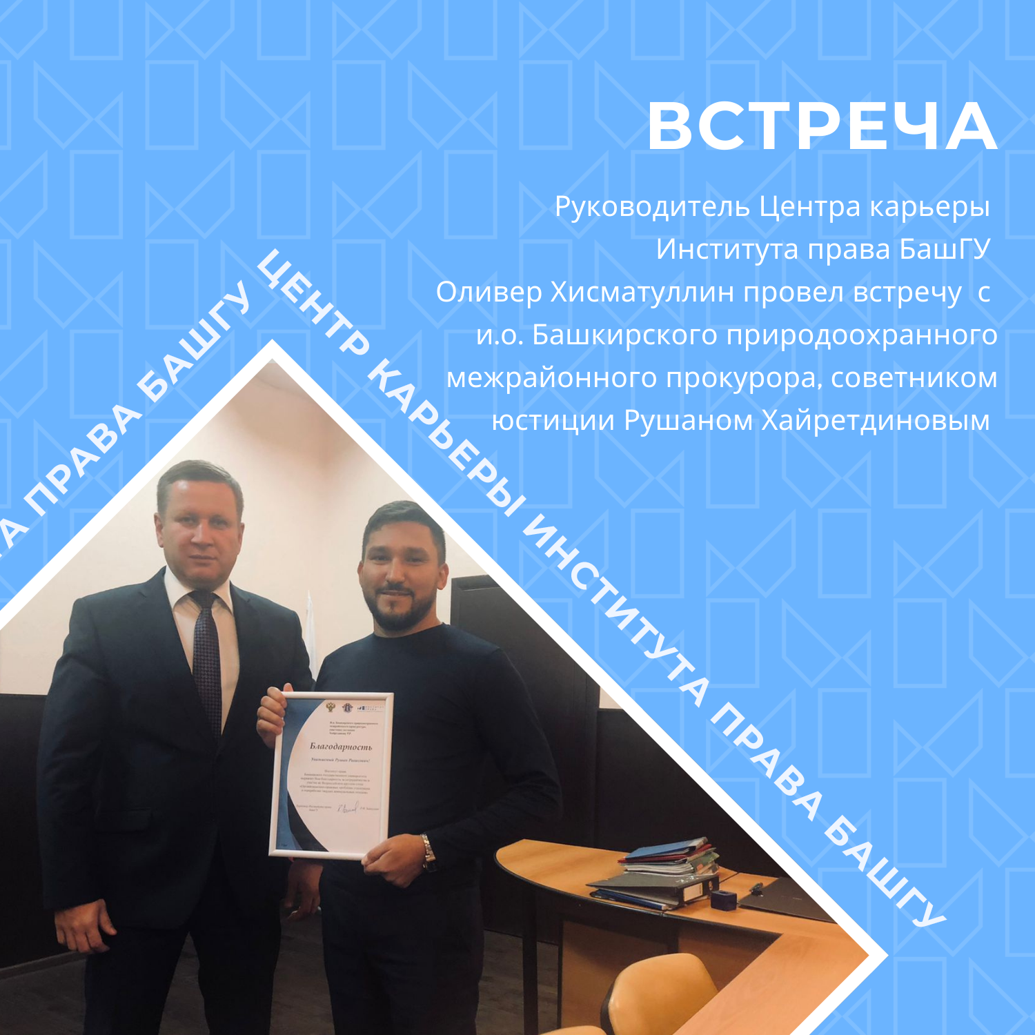 9 сентября 2021 г. состоялась встреча руководителя Центра карьеры Института права БашГУ Оливера Хисматуллина с и.о. Башкирского природоохранного межрайонного прокурора, советником юстиции Рушаном Хайретдиновым.